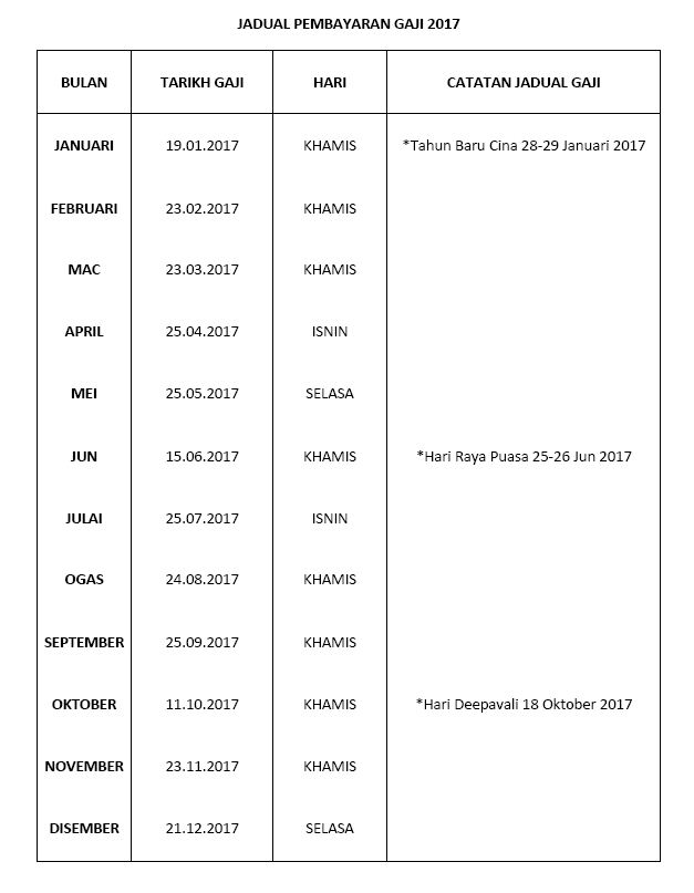 Jadual Pembayaran Gaji Kakitangan Awam Tahun 2017 Appjawatan Malaysia