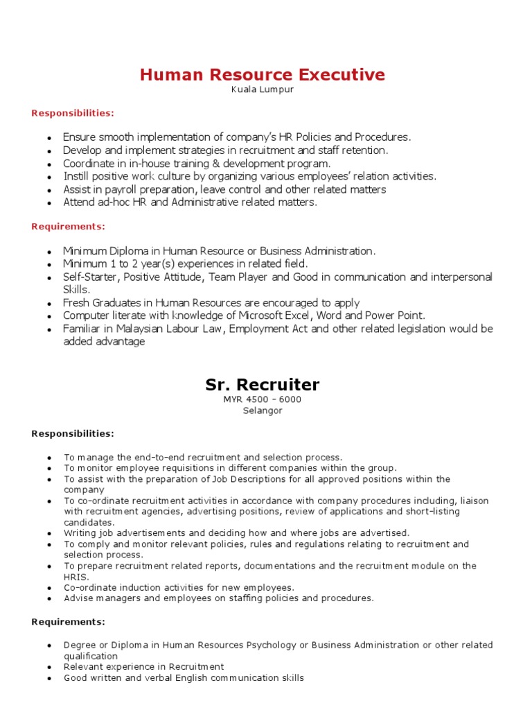 Vacancy Malaysia Hi Friends Out There We Have Vacancy In Hr Department As Per Below Senior Payroll Hr Executive Compensation Benefits Roles Responsibilities Responsible For Monthly Salary