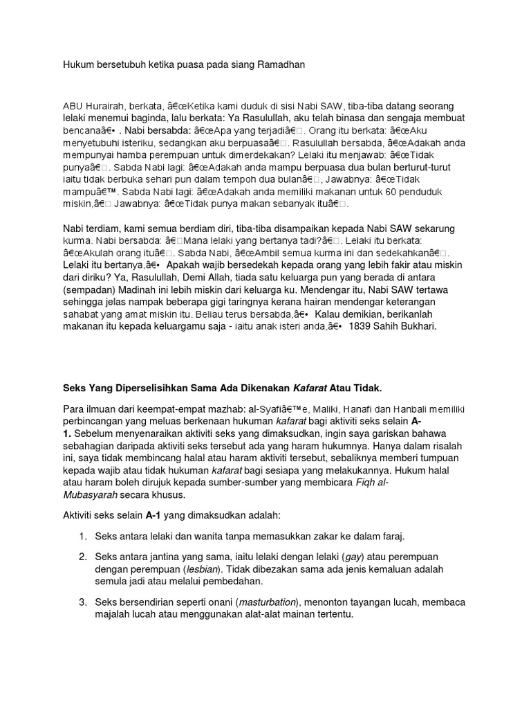 Hukum bersetubuh semasa puasa. Hukum bersetubuh di dalam bulan puasa haram hukumnya dan di kenakan kaffarah kaffarah hanya dikenakan kepada lelaki sahaja seperti berikut. Dan persoalan yang sering diajukan adalah hukum hakam yang berkaitan dengan perhubungan di antara suami dan isteri di siang hari bulan ramadan dan bagaimana jika sengaja membatalkan puasa untuk bersama dengan pasangan. Manakala dari segi istilah pula puasa ialah menahan diri daripada sesuatu yang membatalkan puasa itu seperti makan minum dan bersetubuh mulai terbit fajar hingga terbenam matahari dengan niat dan mengikut syarat.
