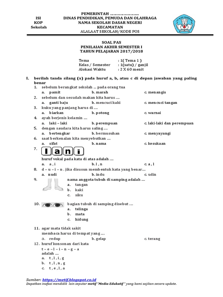 Contoh Soal Ulangan Harian Kelas 1 Sd Semester 1 Tema 1 Diriku