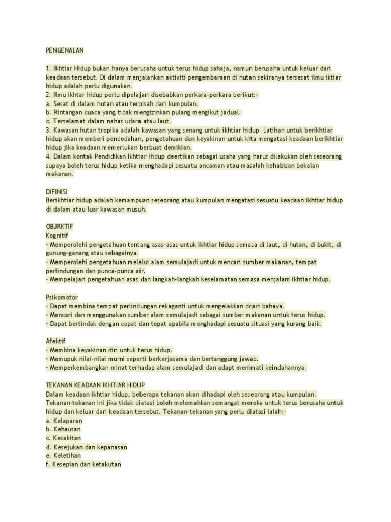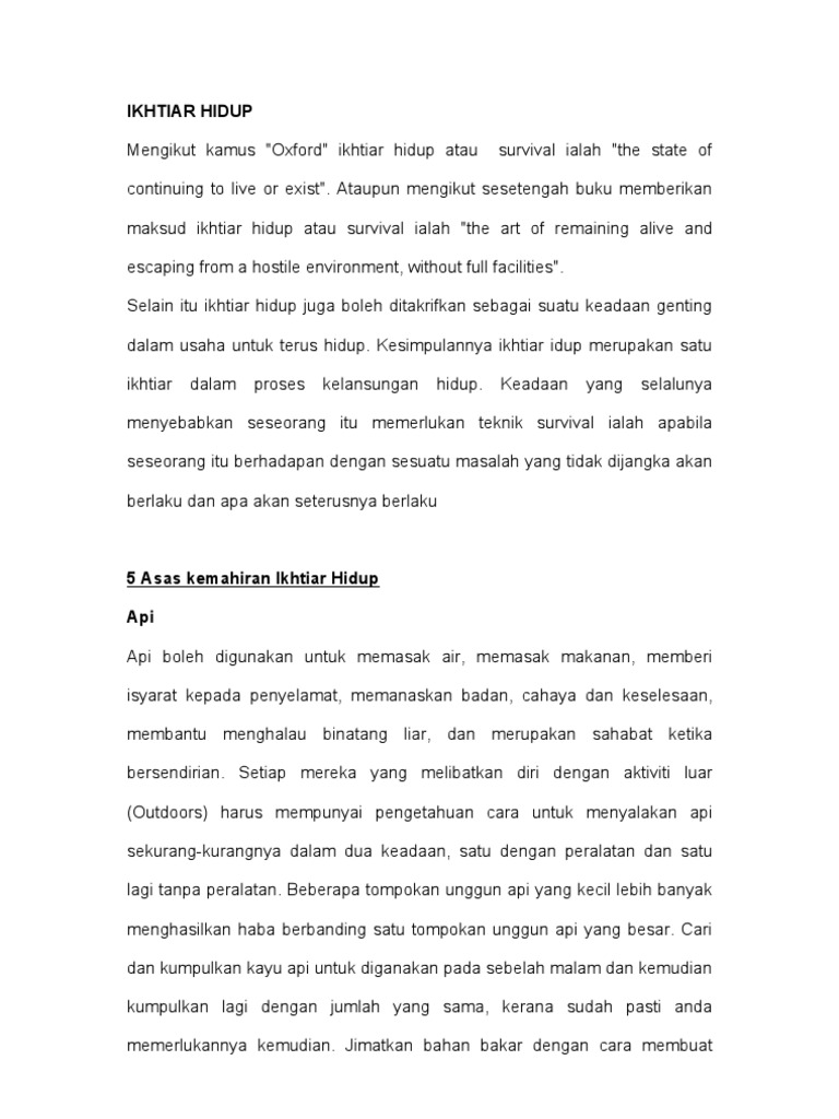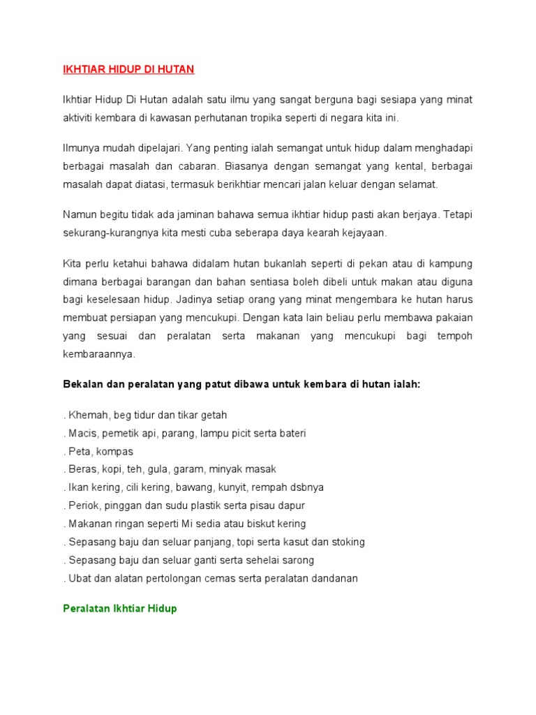 Ikhtiar hidup bukan hanya berusaha untuk terus hidup sahaja namun berusaha untuk keluar dari keadaan tersebut di dalam menjalankan aktiviti pengembaraan di hutan sekiranya tersesat ilmu iktiar hidup adalah perlu digunakan 2. Biasanya dengan semangat yang kental berbagai masalah dapat diatasi termasuk berikhtiar. Ilmu ikhtar hidup perlu dipelajari disebabkan perkara perkara berikut a.