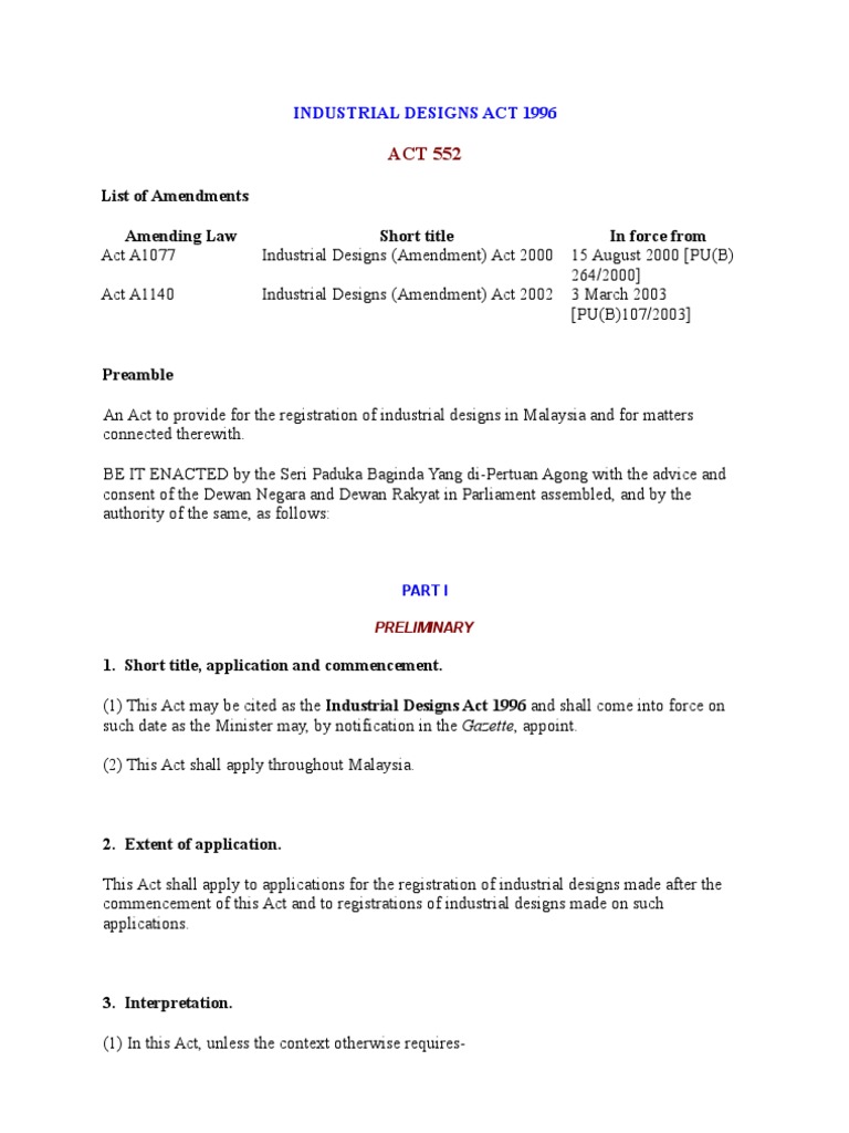 Industrial Designs Laws Of Malaysia Reprint Act 552 Industrial Designs Act Pdf Free Download