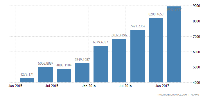 Overall internet speed by akamai technologies q1 2017. Rank country territory average connection speed 1 south korea 28 6 2 norway 23 5 3 sweden 22 5 4 hong kong 21 9 5 switzerland 21 7 6 finland 20 5 7 singapore 20 3 8 japan 20 2 9 denmark 20 1. In the year of 2015 average internet speed malaysia is 5 0mbits s and shows a 17 improvement in internet speed year on year.